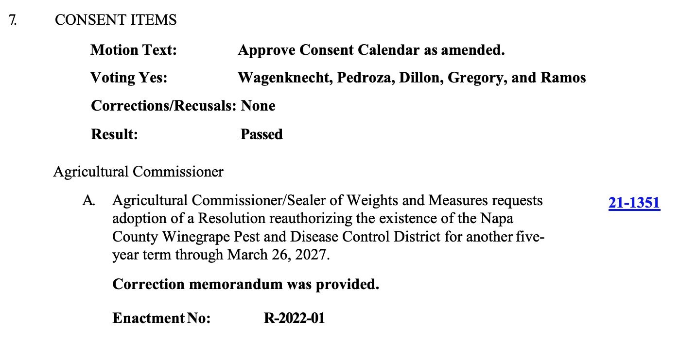 Fantastic News! Napa County Winegrape Pest and Disease Control District Approved for next 5 year term.